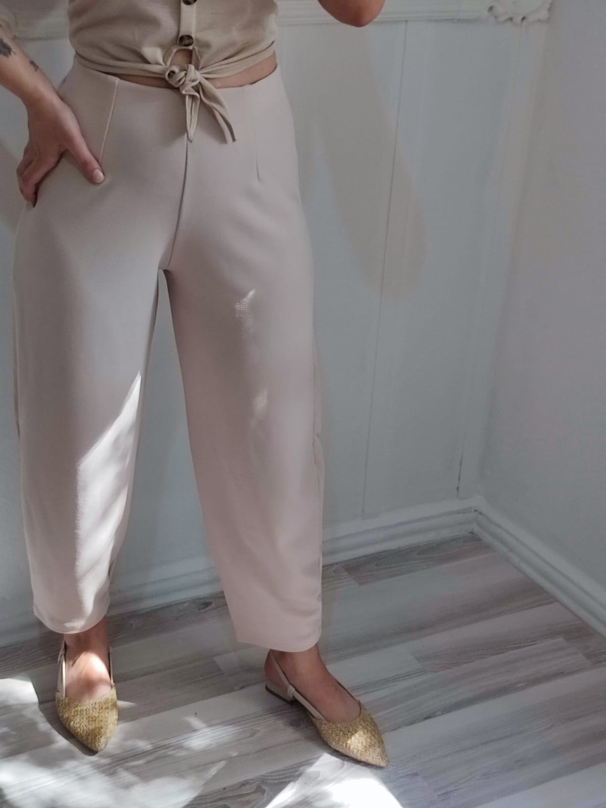 Crep kumaşın tok dokusu ve balon paça kesimiyle hem klasik hem modern bir tarz yakalanır.