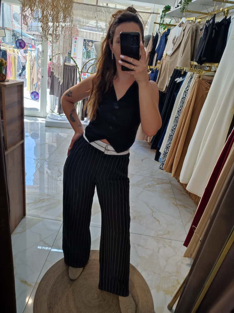 Klasik şıklığı modern bir dokunuşla buluşturan Ters Kemer Detaylı Çizgili Kumaş Pantolon, zarif duruşuyla stiline fark katıyor.